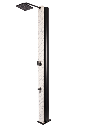 Hliníková solární sprcha s objemem 40 litrů s mramorovou povrchovou úpravou Calacatta Gloss a šířkou 112 mm. Sada obsahuje obdélníkovou mosaznou jednopákovou baterii v matné černé barvě. Má matně černé mosazné rameno (350 mm) na jejímž konci je matně černá sprchová hlavice o velikosti 220 x 200 mm.Tento model je vybaven oplachem nohou.